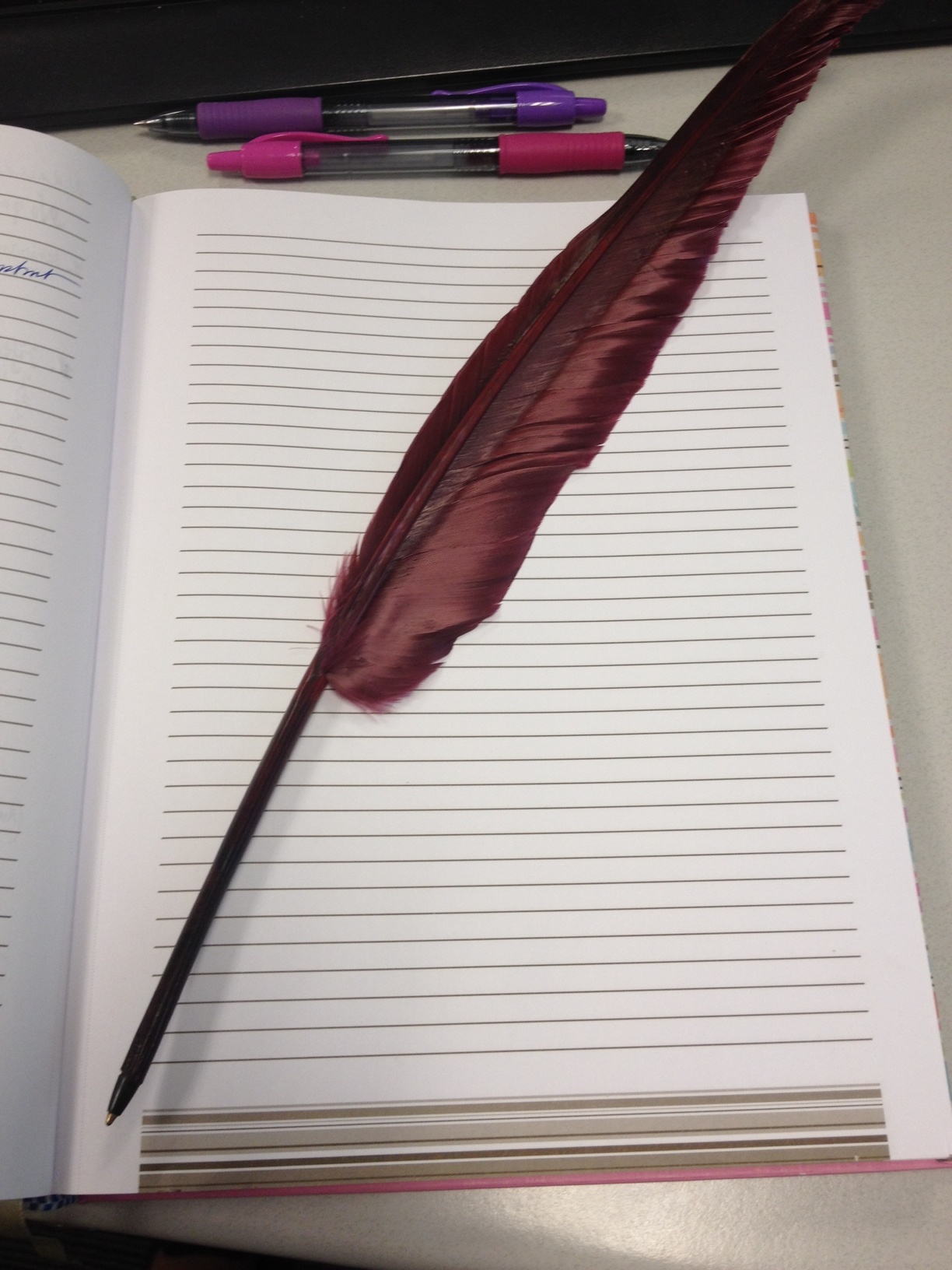 A quill pen, from a colleague! Well, more like synthetic quill, but anyway … She knows I can’t resist pens, journals, stationery, so when she saw this on her trip to the NY Public Library, she got it for me right away. (Note that my purple and pink pens of the day have been pushed aside already).