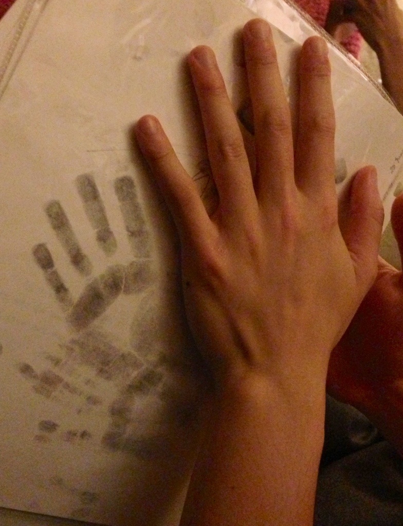 It was only yesterday the boys and I had the crayons out and Henry had me drawing around his & MJ’s hands and I was thinking one day all of this will be history! It makes me a bit sad! But lovely to see the grown up hand next to the toddler handprint!