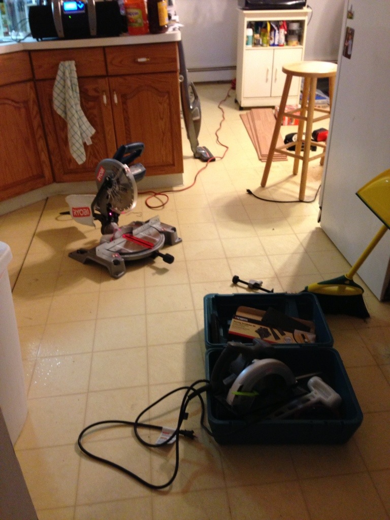 Our summer of home improvement continues.  Hubby Charles was inspired to change the kitchen flooring, and so we went the rounds at Home Depot and Lowe’s to check out what’s available.  Instead of vinyl tiles, he chose these wooden planks instead.  Watching YouTube tutorials, he realized that there was more to it than just fitting the planks together, and ended up buying more tools.  Yeah, I know … more tools and gadgets.  It’s the same thing they say about me and my yarn  🙂