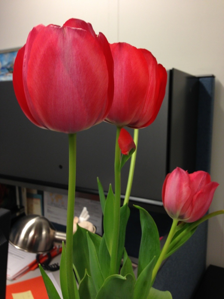 I was passing by a colleague’s cubicle and saw these beautiful tulips. It was so good to see a bright splash of colour … why don’t we have more flowers in the office? There’s lots of plants and vines … an occasional flower every now and then. There’s lots of flowers during the spring and summer, but not in the cold season. Why not have flowers year round? We must remedy that …