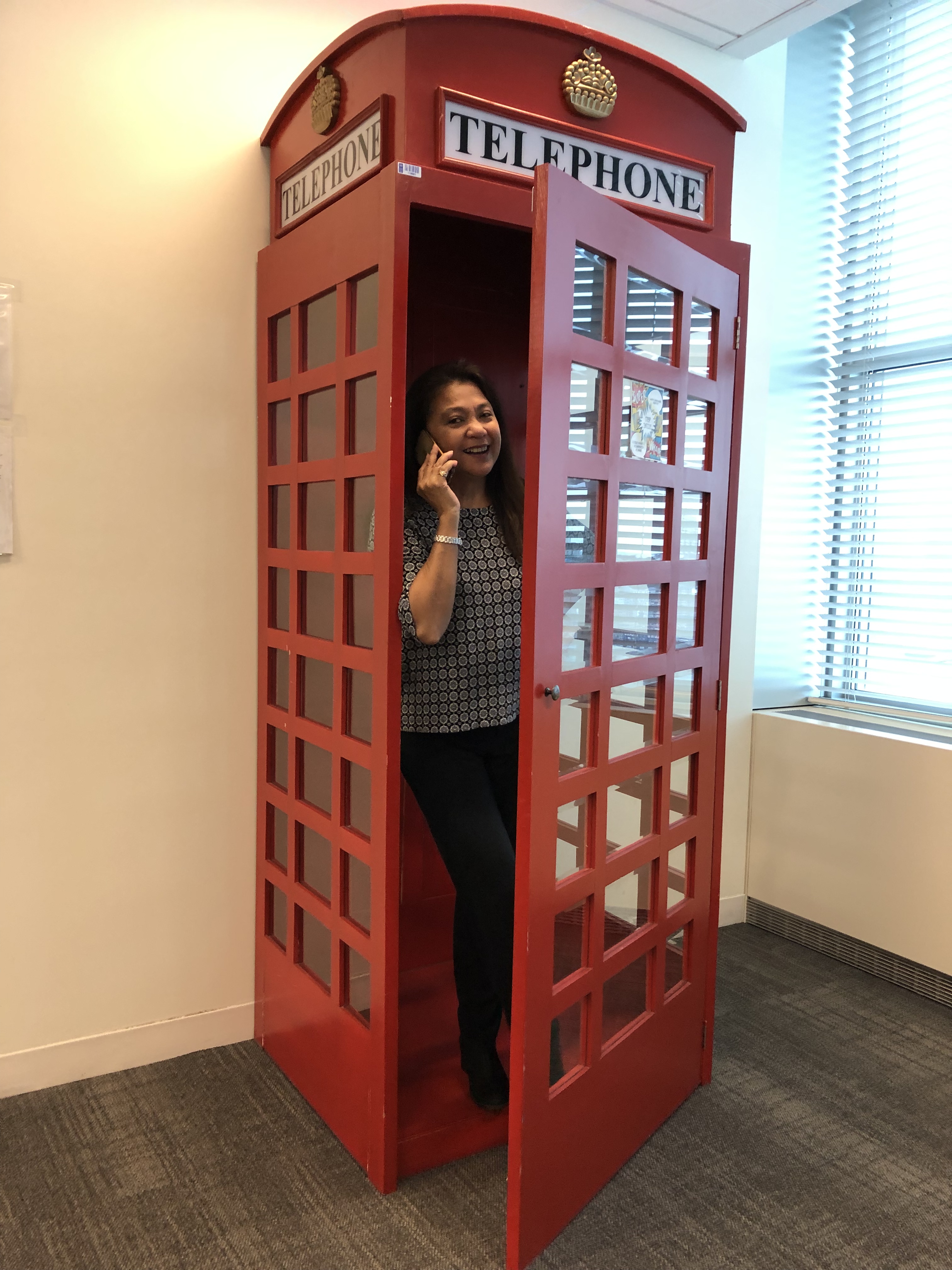 None of those happened … it was just a plain meeting in a conference room … But a red telephone booth brought enough smiles and laughter to the day.